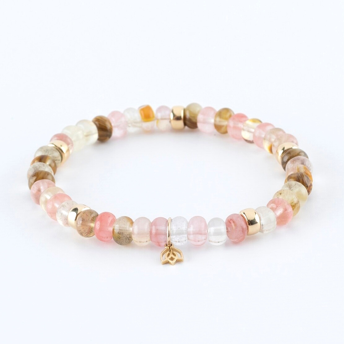 Artikelnummer: 7017Edelstenen armband (6x4mm) met vijf 14k gouden ornamenten en tulp logo. De armbanden van Y&G hebben een luxe uitstraling. Ze zijn fantastisch om solitair te dragen, maar ook heel mooi te combineren met andere armbanden.