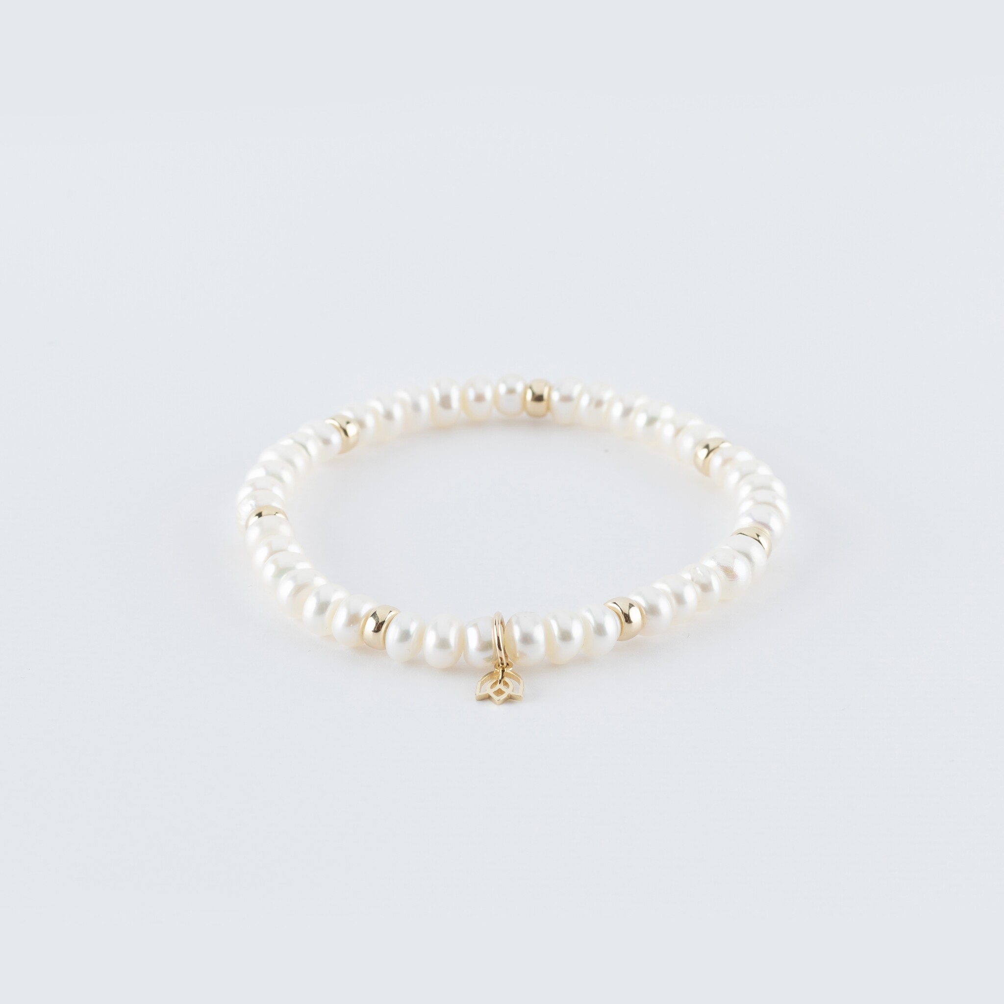 Deze prachtige armband is een combinatie van zoetwaterparels en geelgouden ornamenten.